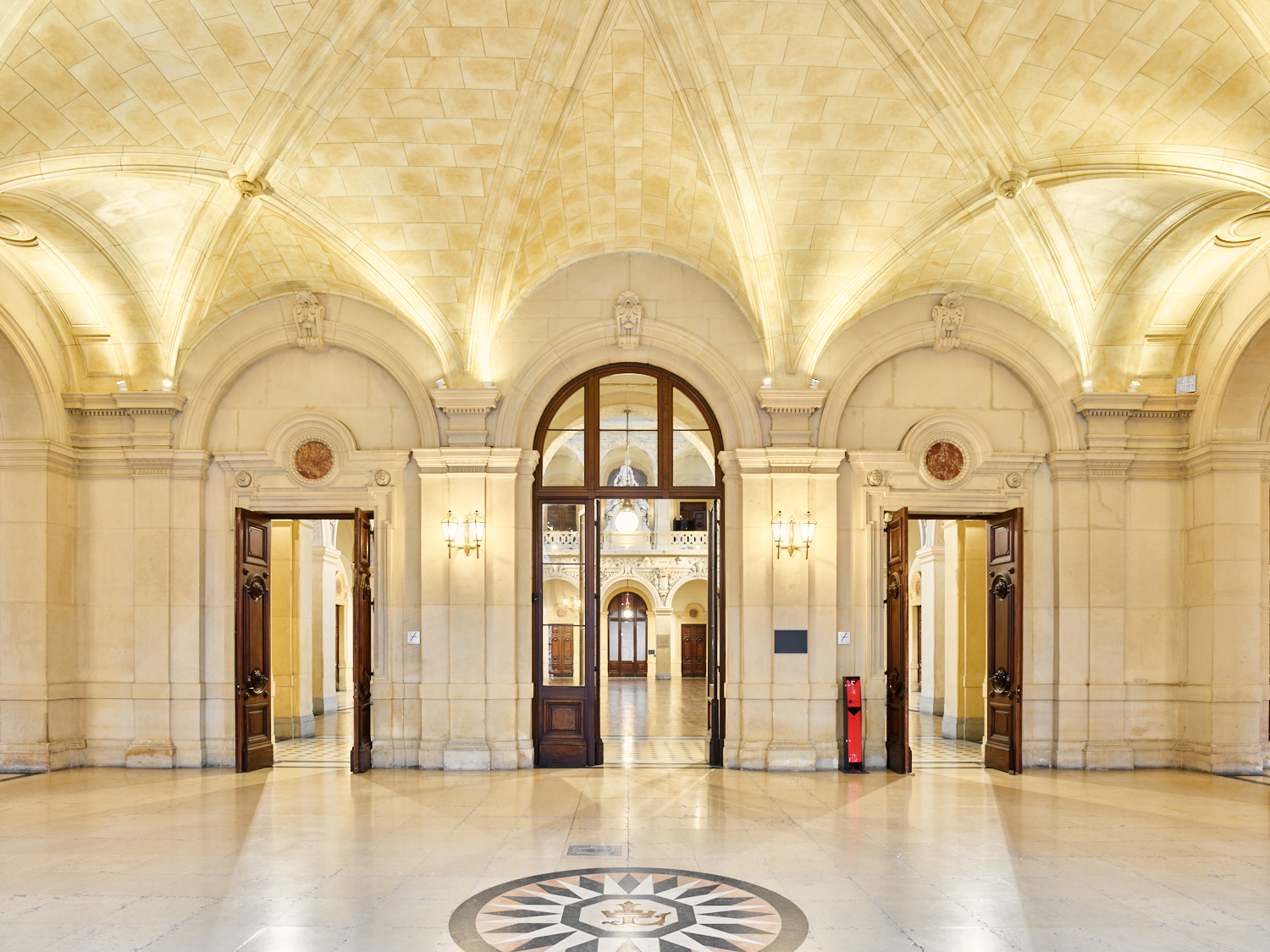 Attenant à la Corbeille, le Salon des Agents de Change est remarquable par son plafond voûté en arcs doubleaux et sa grande rosace décorée par des allégories du Commerce, des Arts et des Vertus.