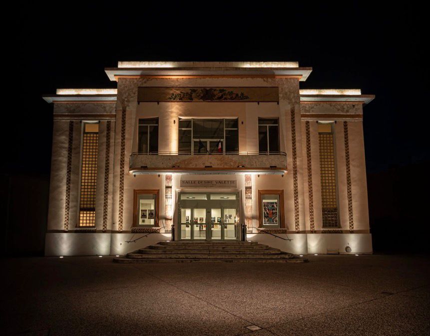 Érigée au début des années 1930, la salle des Fêtes Désiré Valette est l’un des témoins majeurs de l’histoire moderne de Saint‑Vallier. Conçue en 1931 par l’architecte valentinois Jean Brunel et inaugurée en mai 1934, elle se distingue par son architecture Art déco en béton banché, sa façade ornée de vitraux de l’atelier Thomas, et son plafond métallique pensé pour résister au feu. Véritable lieu de vie collective, ancienne “Salle Municipale d’Éducation Populaire”, elle incarne depuis près d’un siècle l’esprit de rassemblement, de transmission et de culture qui façonne l’identité du territoire.